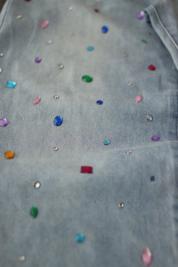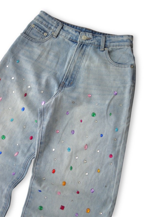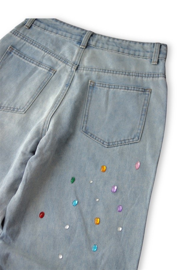 Jean baggy color celeste clasico, con apliques de strass y gemas de colores adelante y atras. No se sale con el lavado.