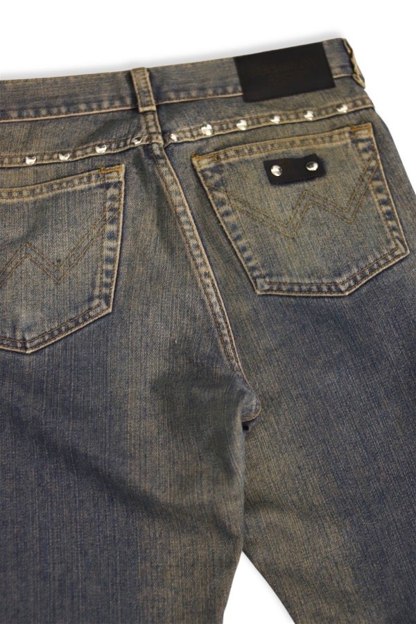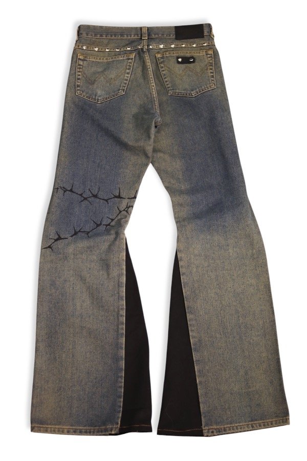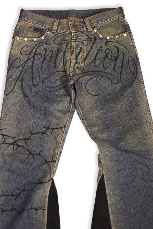 Jean con agregado en la pierna, estampado en negro.