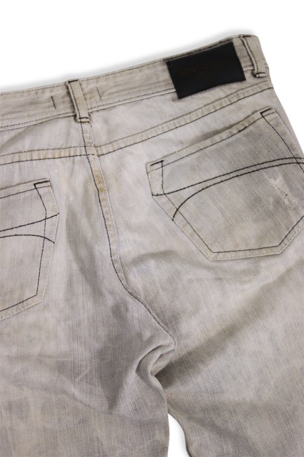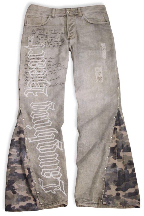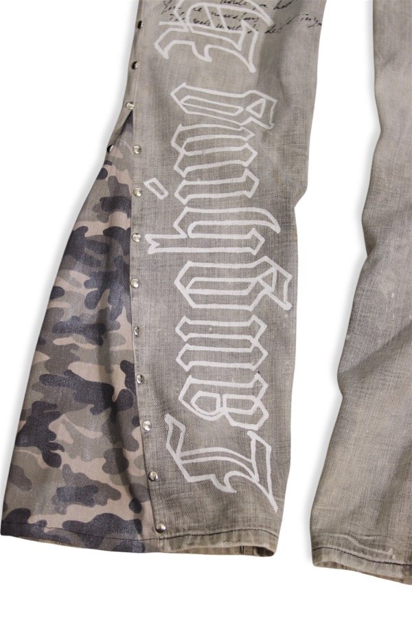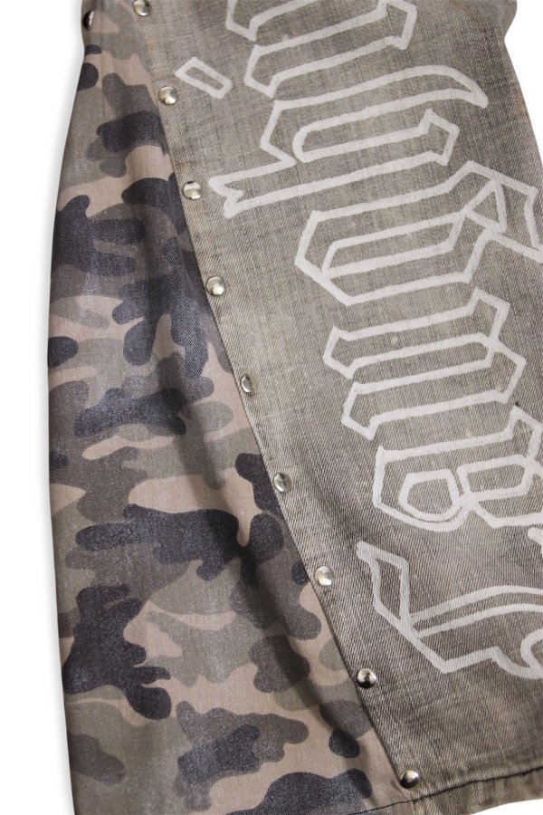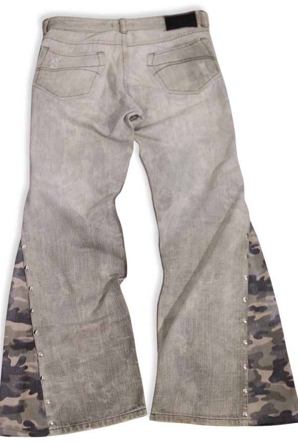Jean gris con agregado de lona estampado camuflado. De adorno en las costuras tiene puesto remaches plateados.