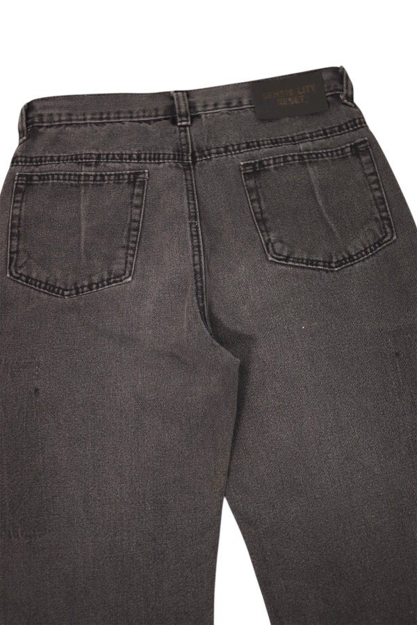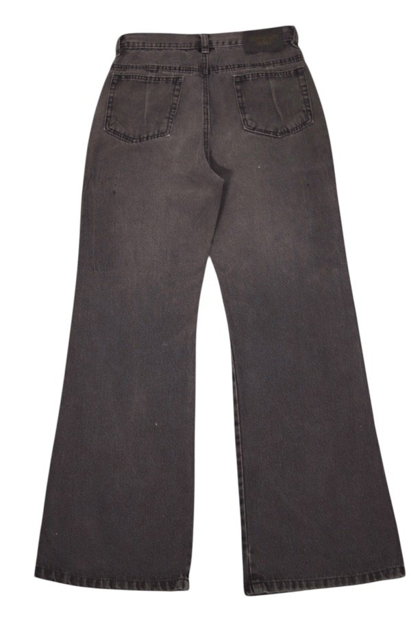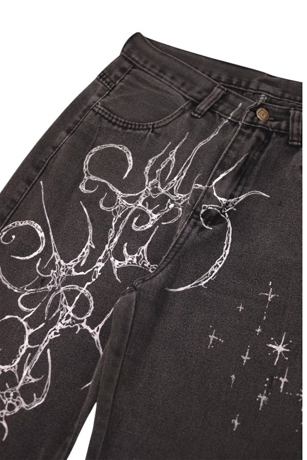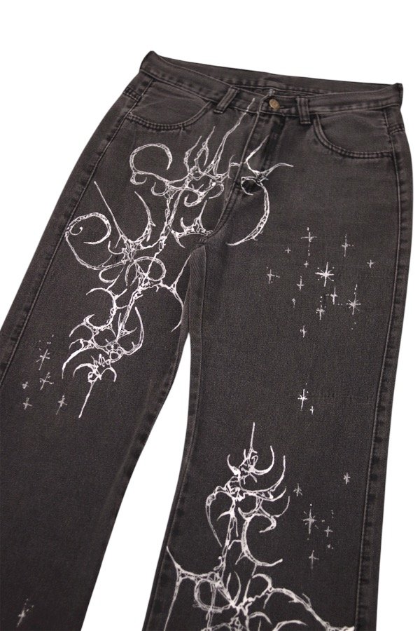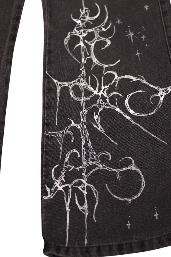 Jean flare negro gastado, con estampa en blanco adelante.