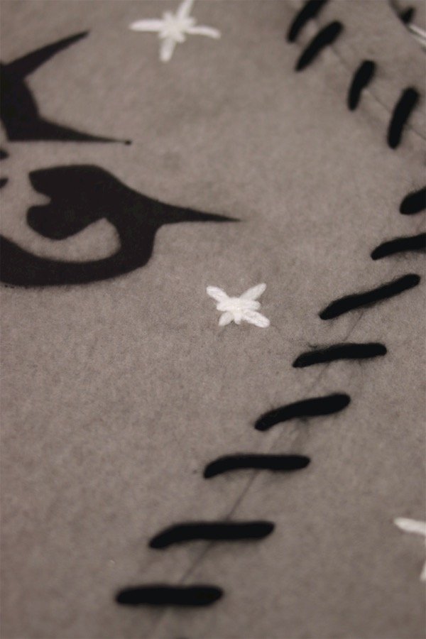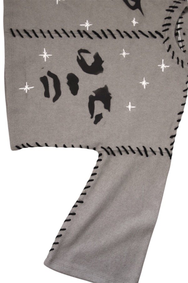 Tiene estampa y bordado, el corte es mangas anchas y hombros caidos.