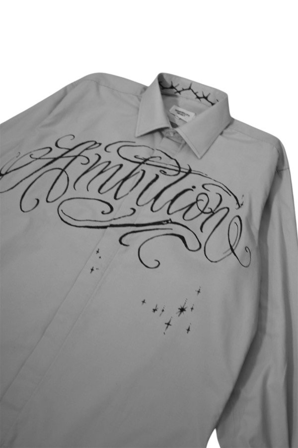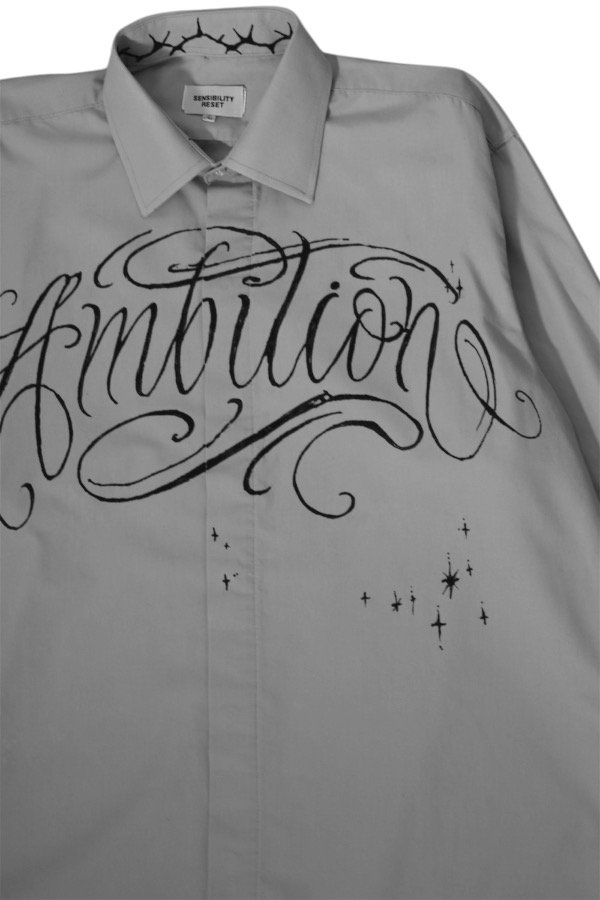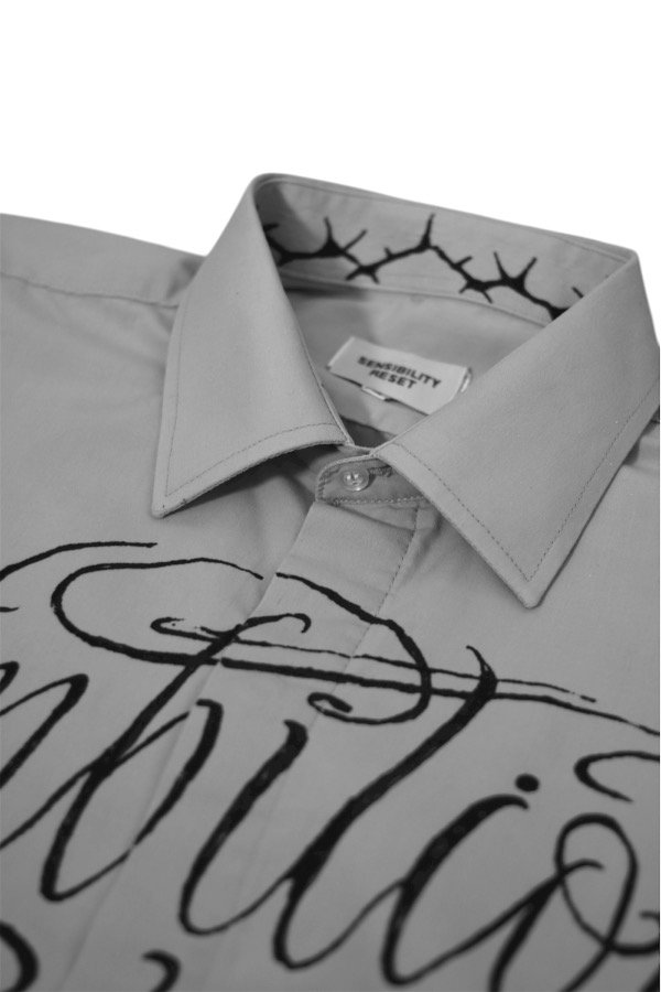 Camisa gris claro mangas largas con estampa en negro adelante.