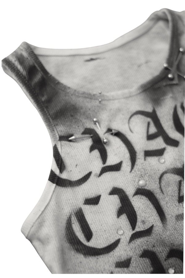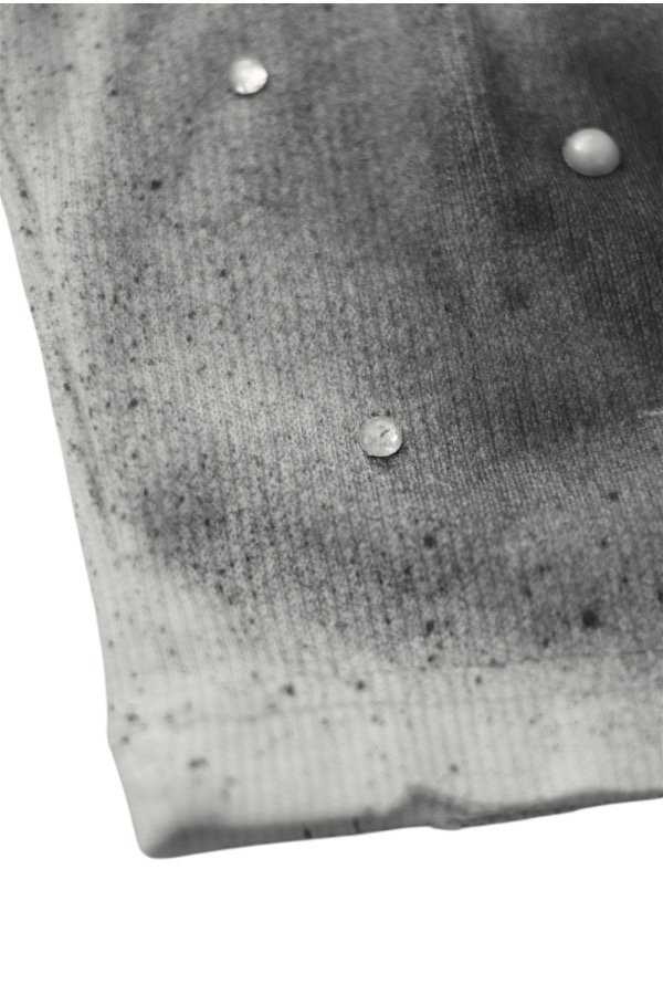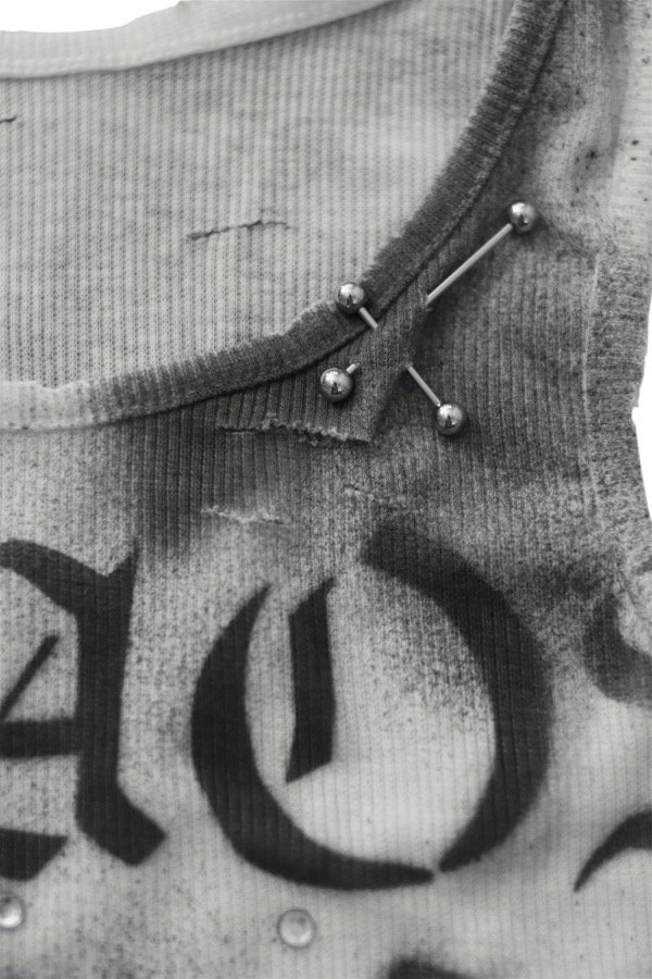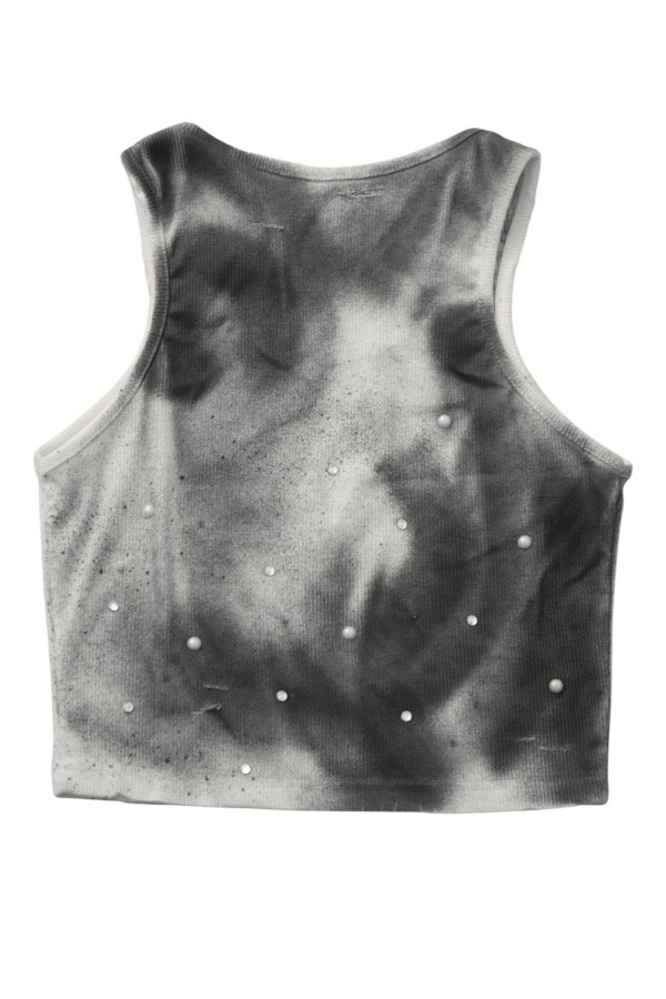 Top de morley estampado, con roturas y apliques de strass, perlas y pircings